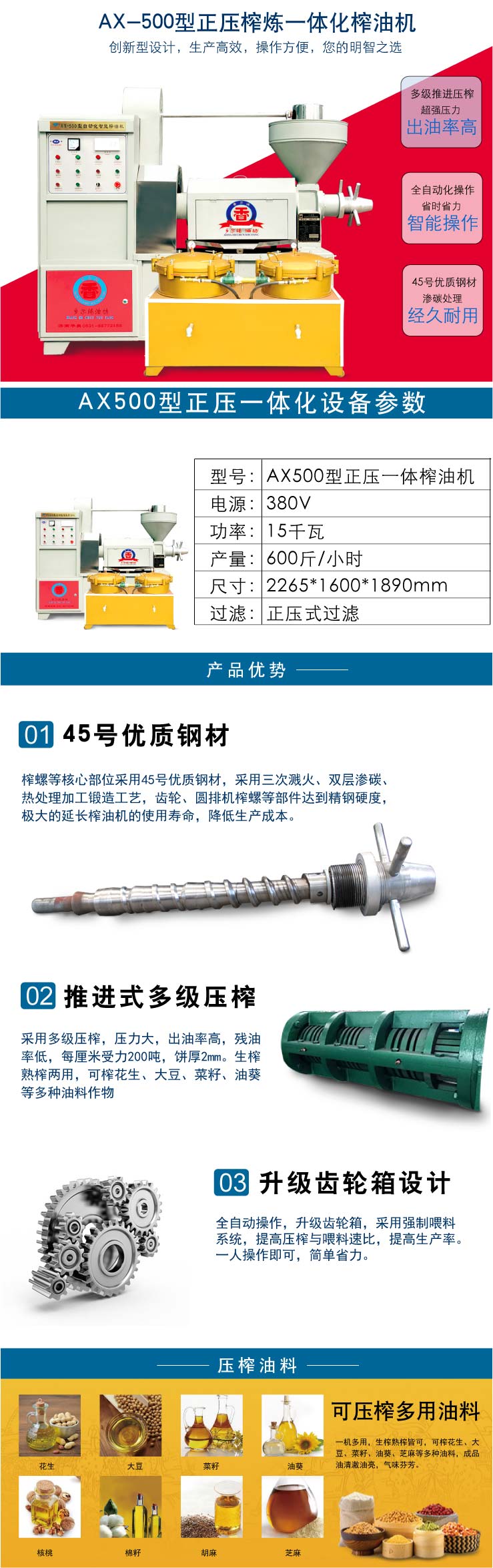 適合油料:花生、大豆、菜籽、油葵、胡麻、芝麻、核桃等,智能操作、優(yōu)化配套。生榨、熟榨皆可,適合現(xiàn)榨現(xiàn)賣或者來料加工,滿足油坊及油廠各種生產(chǎn)需求。