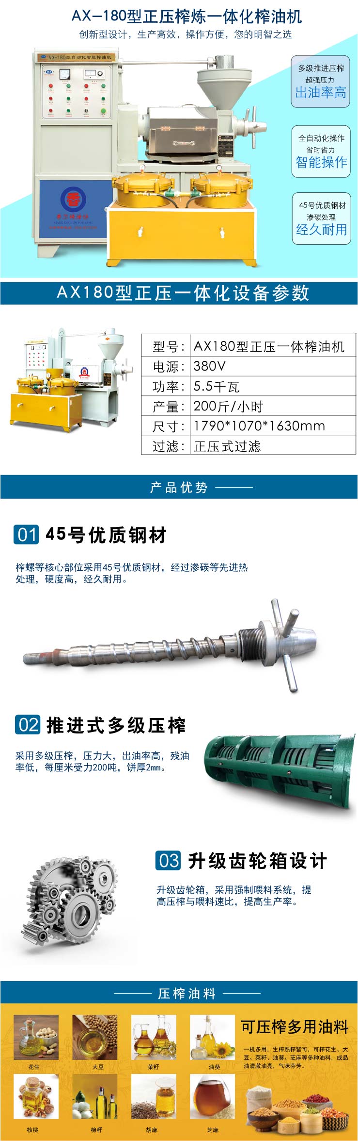 適合油料:花生、大豆、菜籽、油葵、胡麻、芝麻、核桃等,智能操作、優(yōu)化配套。生榨、熟榨皆可,適合現(xiàn)榨現(xiàn)賣或者來料加工,滿足油坊及油廠各種生產(chǎn)需求。